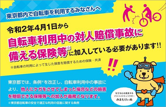 東京都では自転車利用者に対し、損害賠償保険等の加入が義務付けられています。