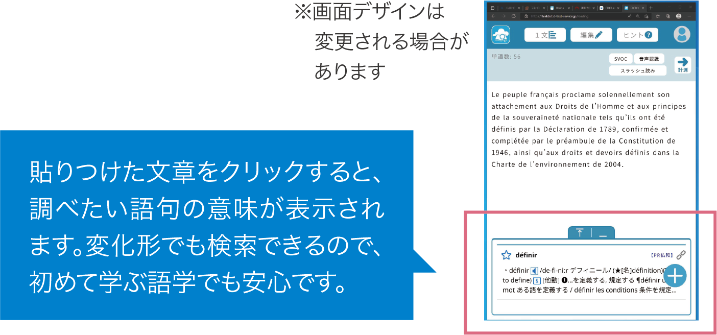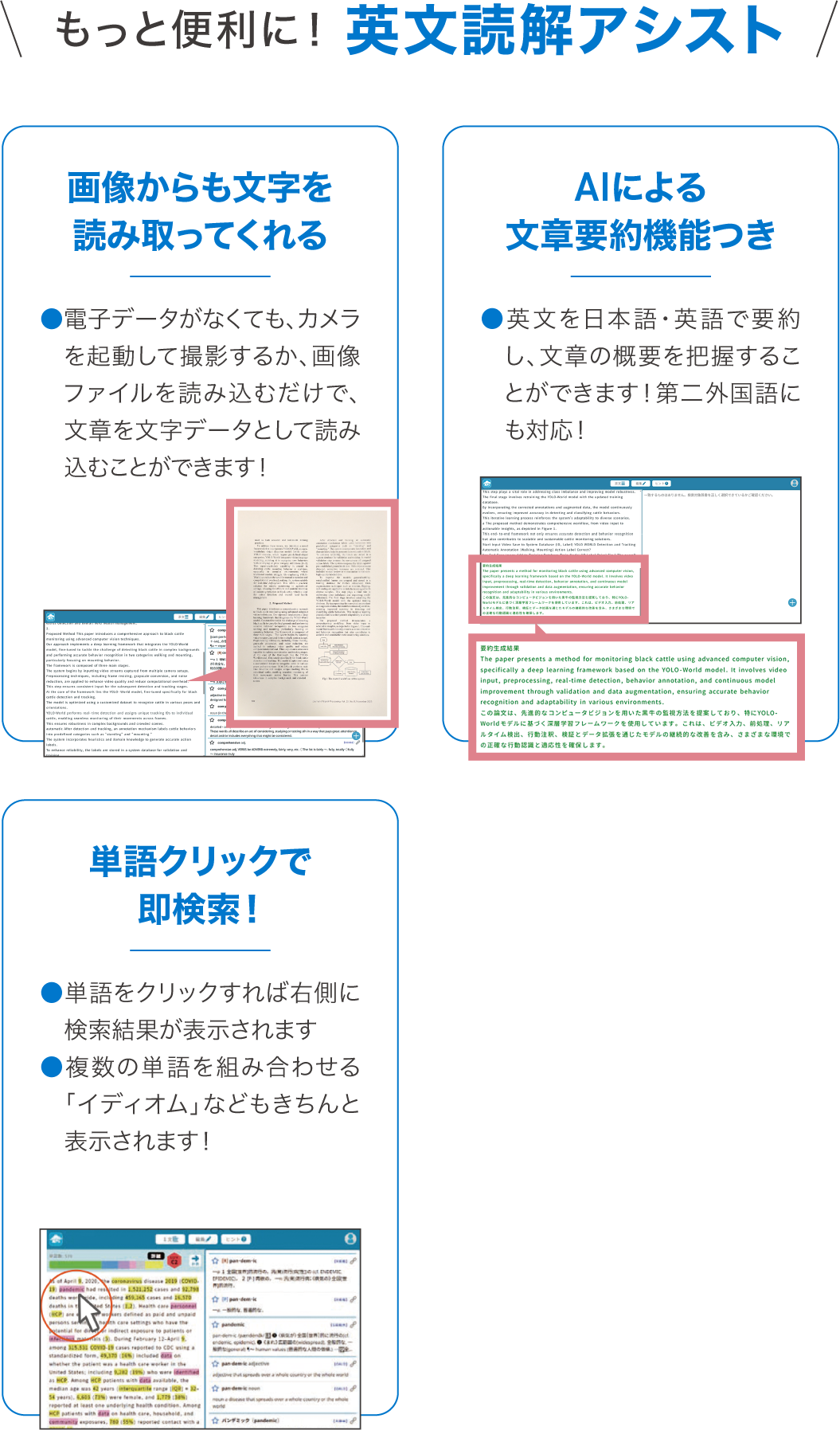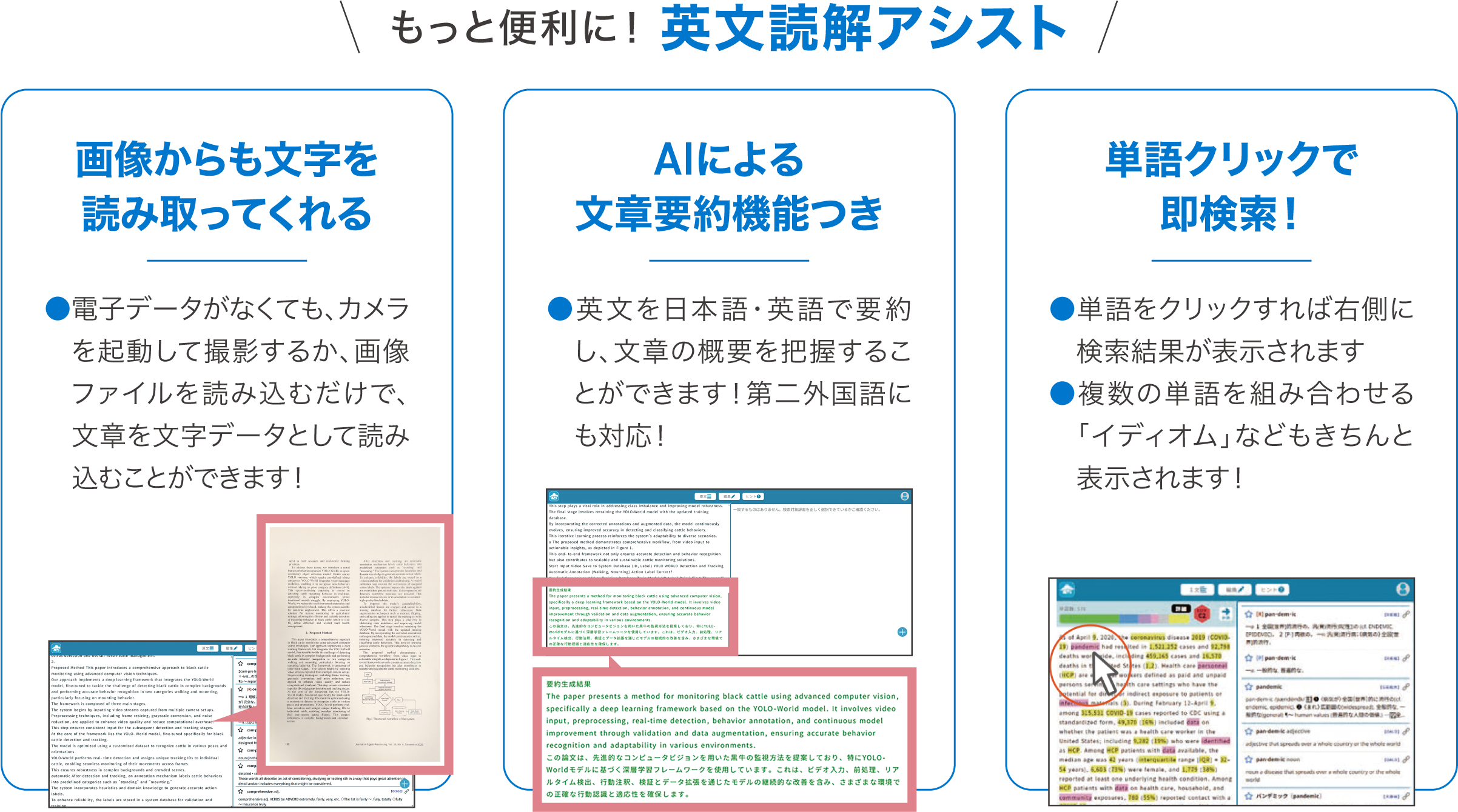 論文やテキストの文章をコピペ・撮影して、単語をワンタッチで辞書検索することができます!英文だけでなく、第二外国語にも対応しています。